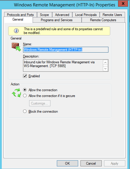 On Server 2012 R2, the WinRM service is already enabled by default. It is a web service, it uses HTTP/HTTPS. The Default TCP port is 5985.