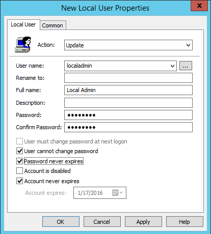 Give the User Name as localadmin and provide a password, also, make sure to that the user cannot change the password and the password never expires as this is going to be an important account on every computer.