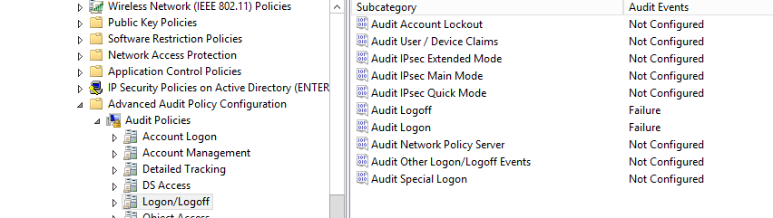 - Logon/Logoff > Account Logoff > Failure.