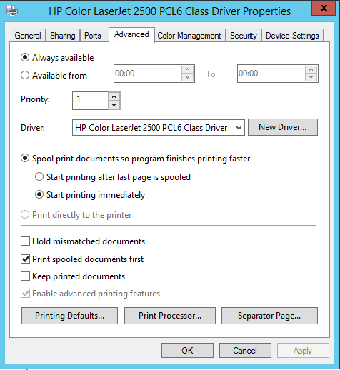 - Create an identical printer using the same printer driver and pointing to the same print device. Leave the Priority setting at its default value of 1 and leave the default permissions in place.