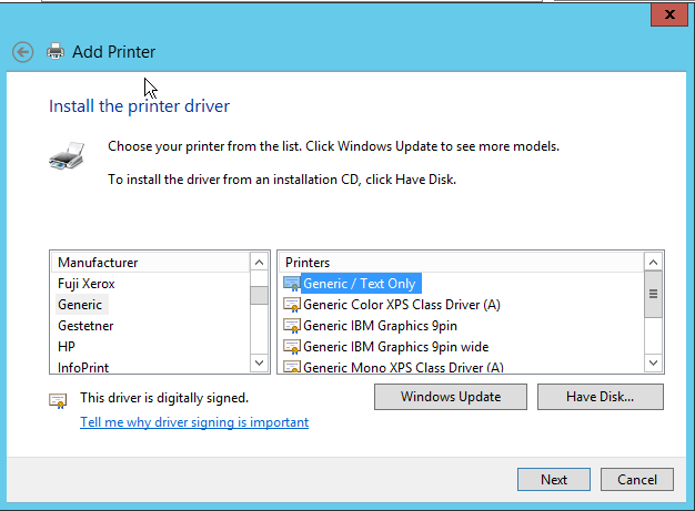 Click On next once you have a printer selected, you will then be presented with the options of Drivers as seen below.