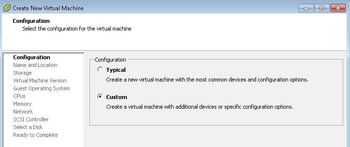 Now you need to open up a New Virtual Machine Wizard and select the Custom Install option.
