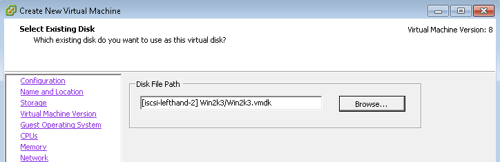 Be careful when you reach the Select a Disk option. You will have to select the existing disk and point it to the primary vmdk file of the Virtual Machine.