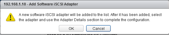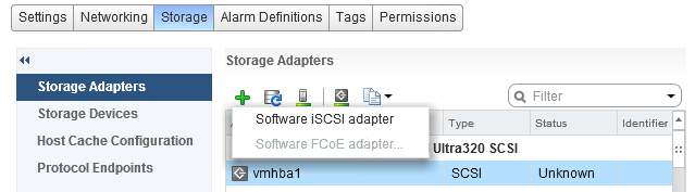 Next step would be to create a Software iSCSI adapter. Click on the host > Manage > Storage > Software Adapters > Add > Software iSCSI adapter