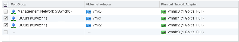 Select the two vmkernel ports that we created in the Networking part of the configuration and click on Ok.