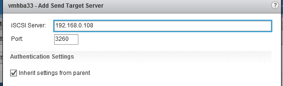 ~ # esxcli iscsi adapter discovery sendtarget add -a 192.168.0.108:3260 -A vmhba33