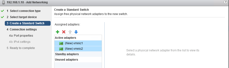 Next, we need to add the uplinks vmnic1 and vmnic2 to the new vSwitch: