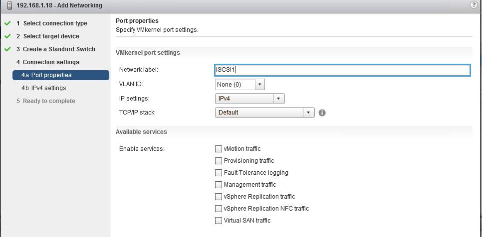 Give the label as iSCSI1 for the vmkernel port and leave the defaults.