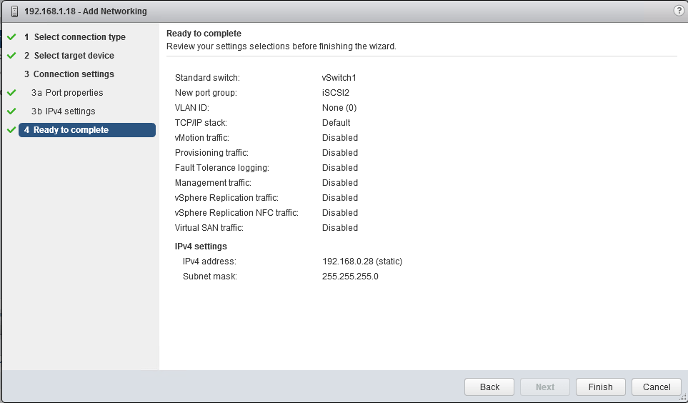 Select an existing switch (vSwitch1), provide the name as iSCSI2 for the vmkernel port. Provide the IP address and click on Finish.