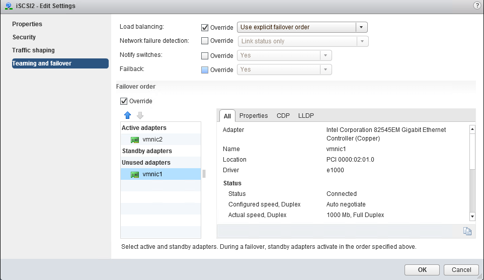 ~ # esxcli network vswitch standard portgroup policy failover set -a vmnic1 -p iSCSI1